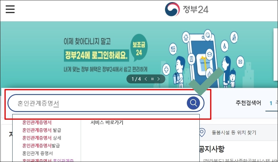 3. 정부 24 홈페이지에 접속해서 혼인관계증명서, 가족관계증명서, 주민등록표등본에 대한 발급을 받을 수 있습니다. 검색을 통해 쉽게 발급 서비스를 찾을 수 있습니다.