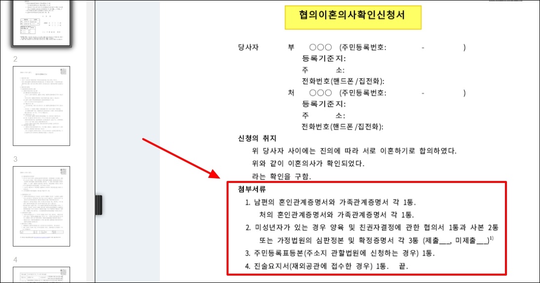 1. 앞서 언급한 바와 같이 이혼하는 방식이나 가정 상황에 따라 요구되는 문서가 다를 수 있습니다. 제가 설명하는 것은 대다수의 경우에 해당하는 것이오니 참고 바랍니다. 법원에서 작성하고, 제출하게 되는 협의이혼의사확인신청서 양식에 보면 첨부해야 하는 서류가 있습니다.