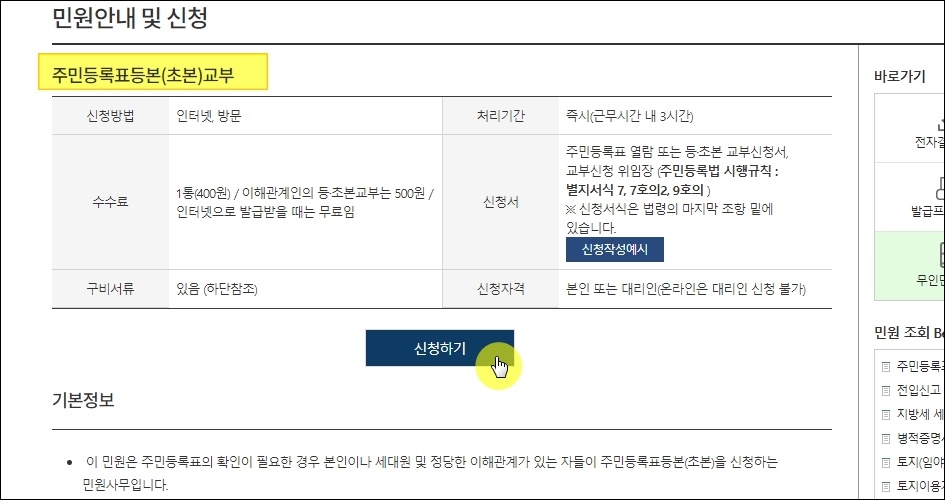 5. 주민등록표등본 또한 인터넷으로 발급을 받을 때에는 무료입니다. 동사무소에 가면 1통에 400원이오니 참고해 주시길 바랍니다.