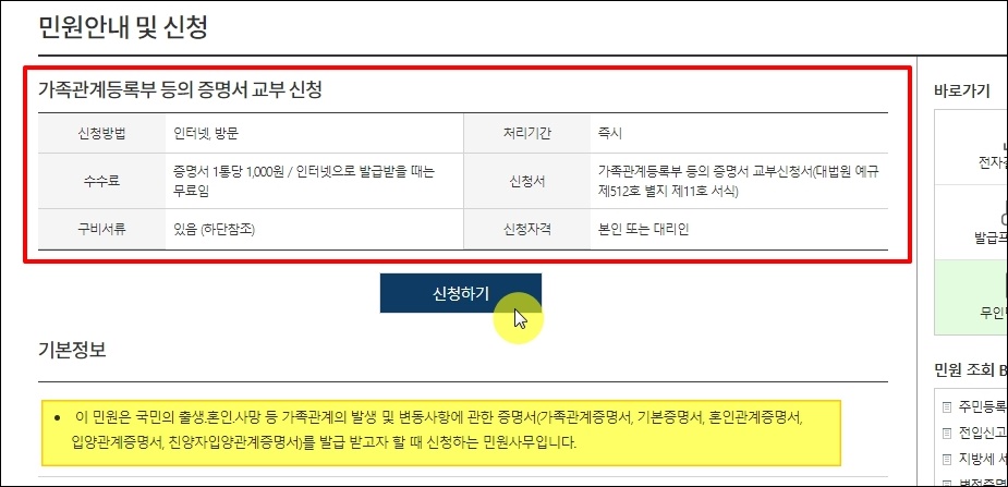 4. 가족관계등록부 등의 증명서를 인터넷을 발급 받을 때에는 비용이 무료입니다. "신청하기" 버튼을 누른 후 안내에 따라 서류 발급을 진행하면 됩니다.