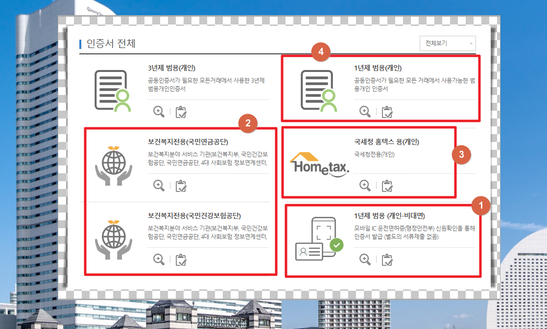 국세청, 보건복지, 범용 등 사용 용도나 방법에 따라 선택하면 되는데요.