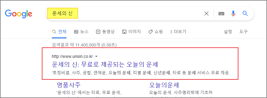 간단한 검색을 통해 토정비결을 무료로 볼 수 있는 운세의 신 사이트에 접속할 수 있어요.