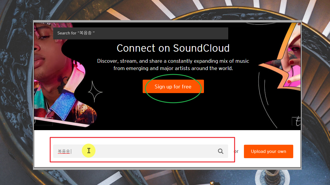 사운드 클라우드 사이트에 접속했습니다. 메인 화면에 보면 회원 가입을 하는 버튼이 있는데요. 무료로 회원 가입을 할 수 있어요. 그다음에 바로 아래 있는 검색창에서 "복음송"을 입력한후 검색 버튼을 눌러 주세요.