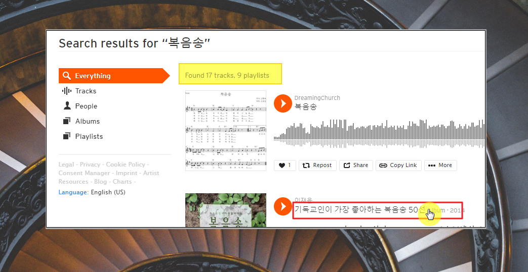 검색 결과가 나왔습니다. 우리가 찾던 베스트 복음송 앨범뿐만 아니라 다양한 음악 트랙과 앨범, 플레이리스트(모음)를 만나 볼 수 있는데요. 이 중에서 제가 처음에 알려드린 기독교인이 가장 좋아하는 "복음송 50선" 앨범을 마우스로 클릭해주세요.