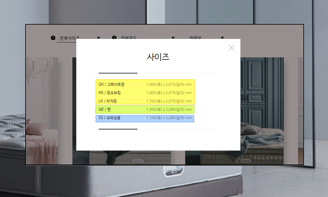 ▲ 가장 먼저 사이즈에 관련된 등급 입니다. 시몬스에서는 그레이트킹, 킹오브킹, 라지킹, 퀸, 슈퍼싱글 이렇게 5단계로 사이즈가 구분이 되는데요. 퀸 사이즈의 경우에는 여러 회사에서 그러하든 1500mm의 폭으로 동일하지만, 슈퍼싱글의 경우에는 1200mm(폭)을 사용하는 곳도 있어서 조금 좁을 수 있습니다. 그리고 킹 사이트의 경우에는 3단계로 구분이 되어 있는데요. 요즘 많이 구입하는 이케아의 경우에는 킹 사이즈가 1800mm(폭)입니다. 혹시라도 이케아에서는 프레임을 구입하고, 시몬스에서는 매트리스를 구입하는 경우에는 이러한 사이즈를 꼭 확인하시길 바랍니다. 또 한 가지 주의깊게 봐야 하는 부분은 시몬스의 경우 킹 사이즈 길이가 2,075mm입니다.
