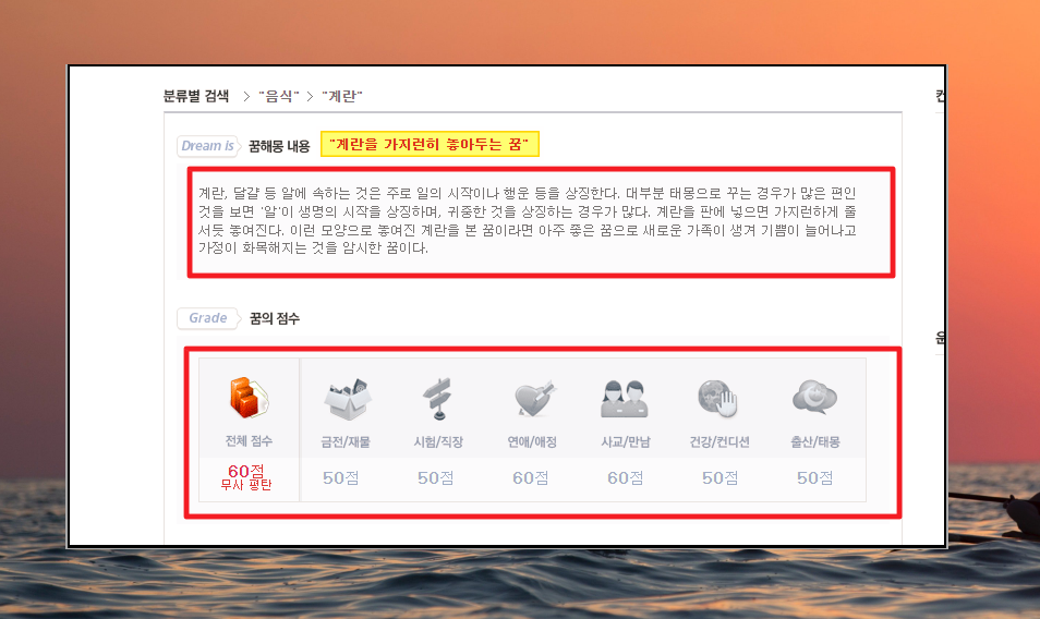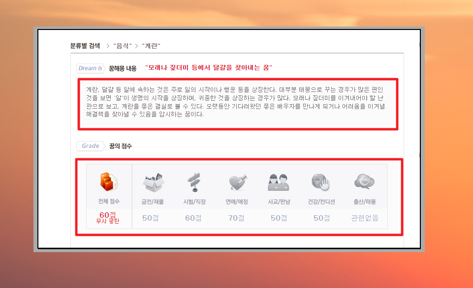 달걀이 나오는 꿈은 보통 좋은 의미로 해석이 되는데요. 점수를 살펴 보았을 때 60점으로 "무사 평탄"이라는 결과가 나왔습니다.