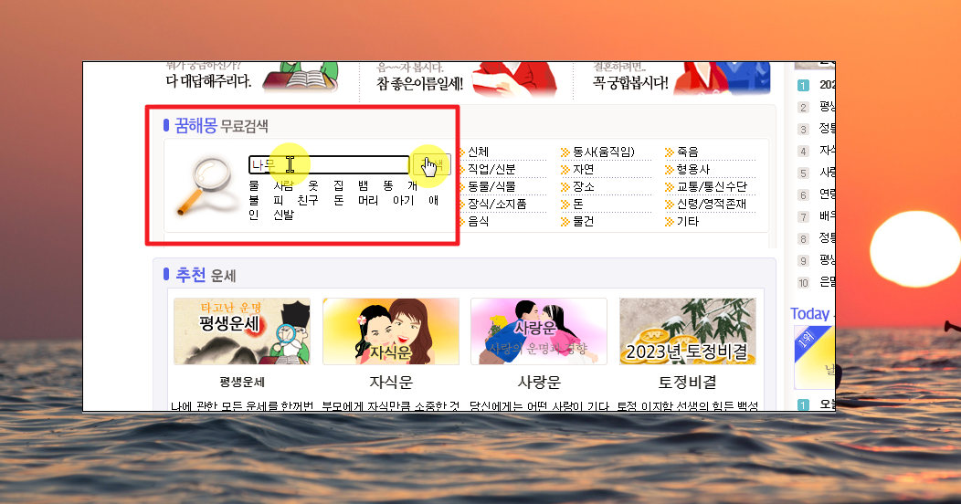 사이트에 접속하면 바로 꿈해몽 무료 검색 창이 열립니다. 여기에서 어젯밤 꿈에 관련된 소재를 입력한 후, 검색 버튼을 눌러 주세요. 또는 카테고리를 선택하는 방식이 있는데요. 신체, 직업, 신분, 동물, 식물, 장식, 소지품, 음식, 자연, 장소, 돈, 물건 등 여러 가지 카테고리에서 선택을 하면 됩니다.
