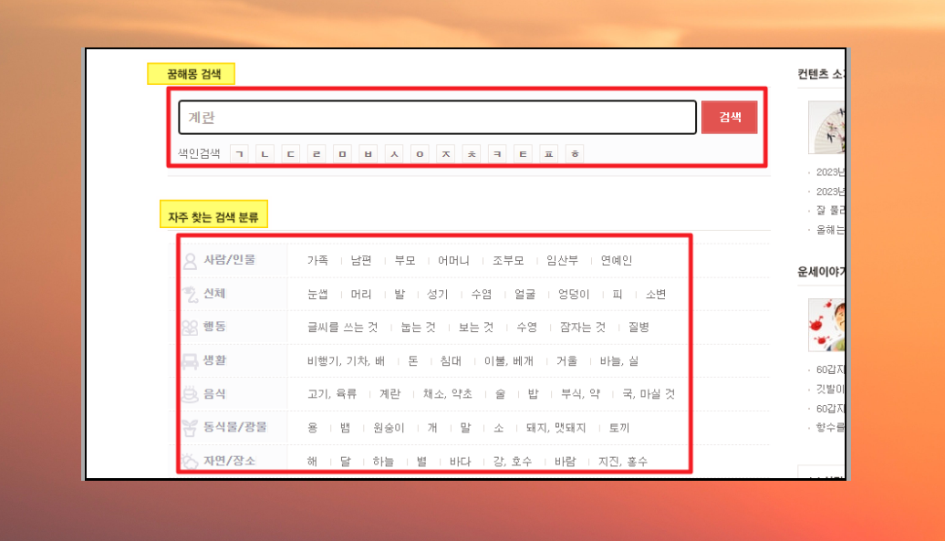 이번에는 꿈풀이 검색을 위한 두 가지 방법을 알려드리려고 합니다. 일반적으로 해몽 서비스를 이용할 때에는 검색 방식과 카테고리 방식 이렇게 2가지가 있는데요. 2가지 방법 모두 이용 가능한 사이트 2곳을 알려드리겠습니다.