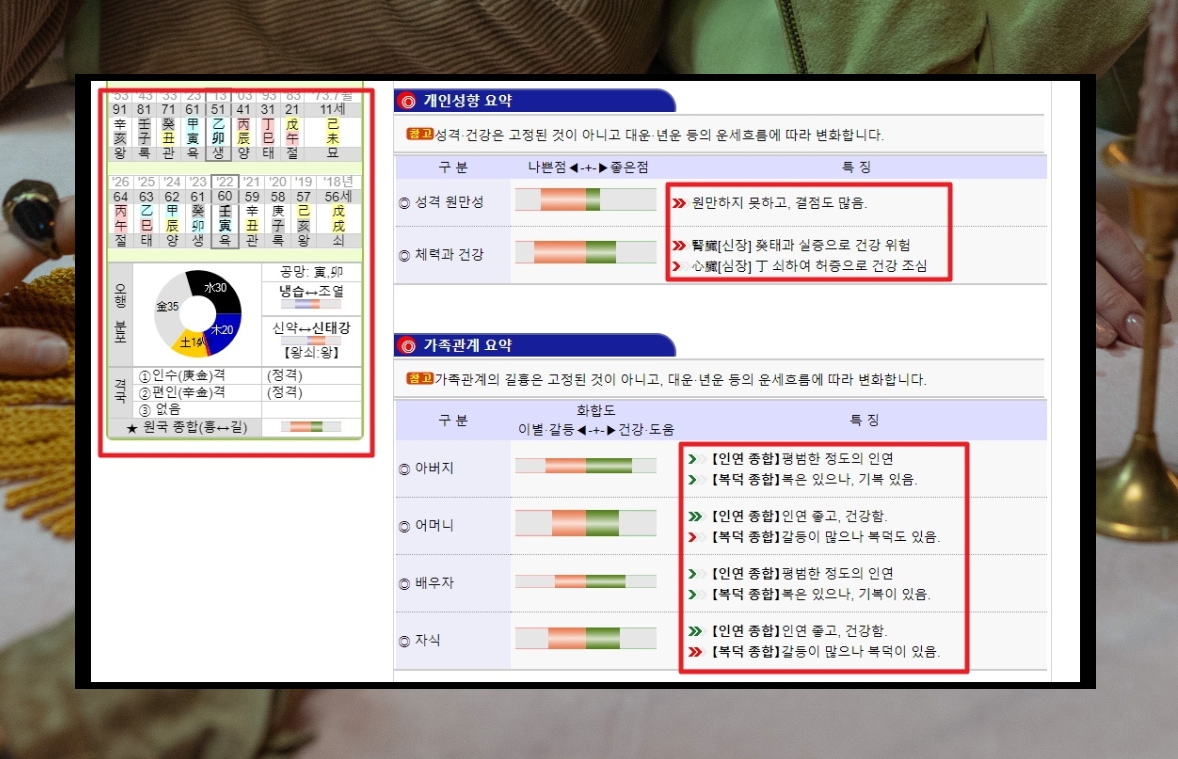 6. 사주풀이도우미 사이트에서 좌측을 보면 오행 분포를 볼 수 있습니다. 본인이 목, 수, 화, 토, 금 중에서 어떤 것이 많은지 쉽게 알아볼 수 있습니다. 화면 중앙에서 오른편에는 개인성향과 가족관계에 대한 내용이 나오는데요. 이를 통해 성격 원만성, 체력과 건강, 가족과의 화합도를 볼 수 있습니다.