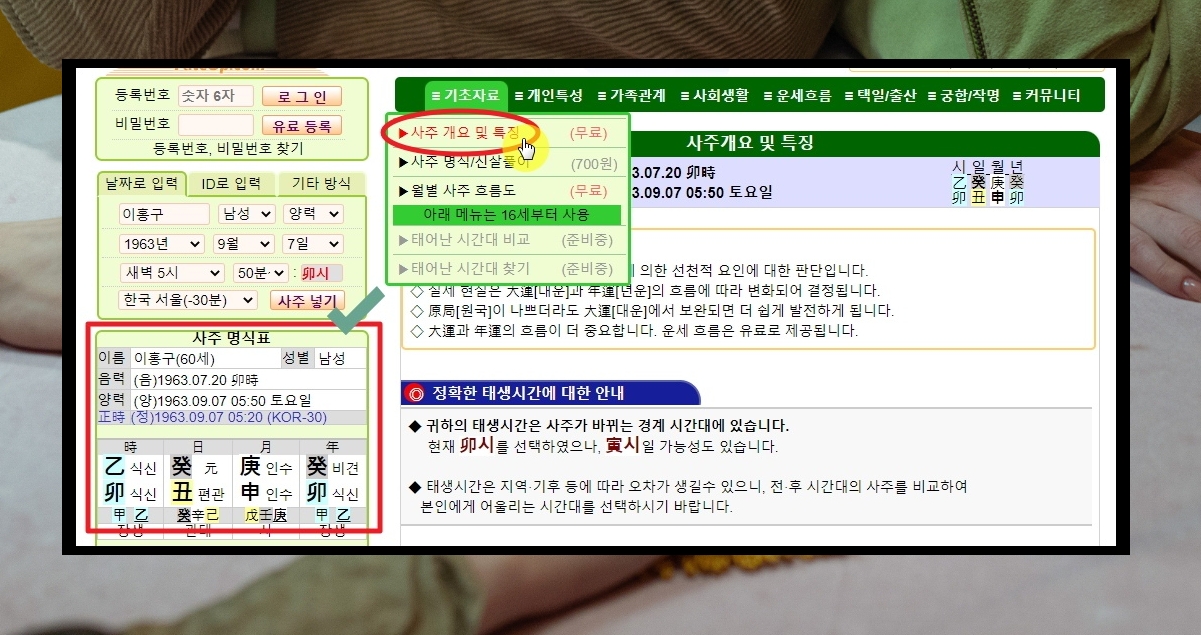 5. 이번에는 상세한 해석을 만나볼 수 있는 만세력 서비스를 이용해 보겠습니다. 상단에 있는 메뉴에서 [기초자료]와 [사주 개요 및 특징]을 선택해 주세요. 월별 사주 흐름도와 함께 무료 보기 가능한 서비스입니다.