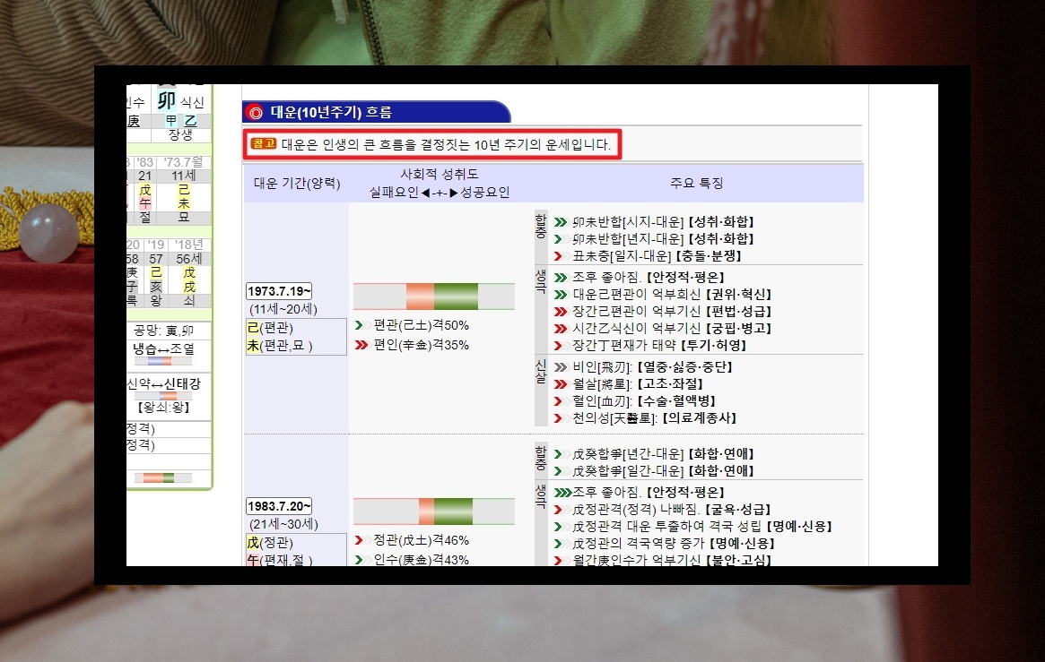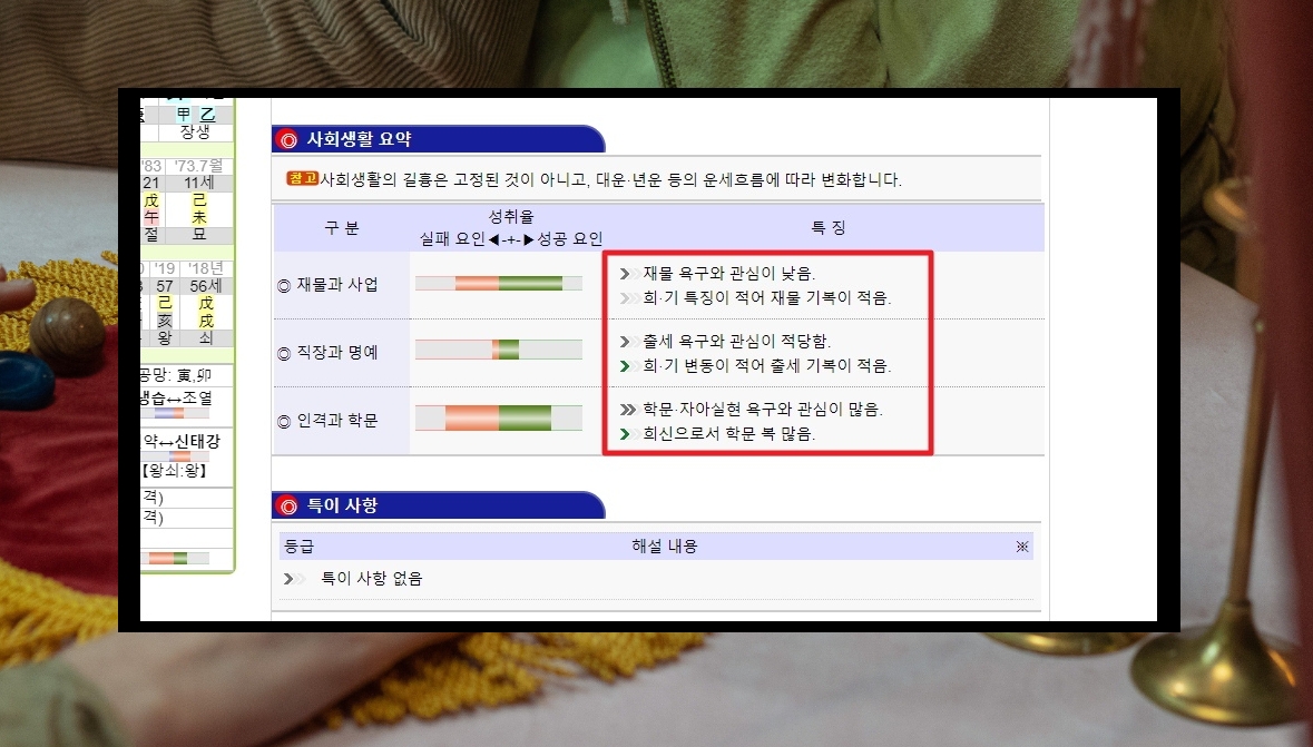 7. 사회생활에 관련된 재물, 사업, 직장, 명예, 인격, 학문에 대한 내용도 만세력 서비스를 통해 보기 가능한데요. 사회생활의 길흉은 고정된 것이 아니라고 합니다. 대운과 연운 등의 운세 흐름에 따라 변할 수 있다고 하네요.