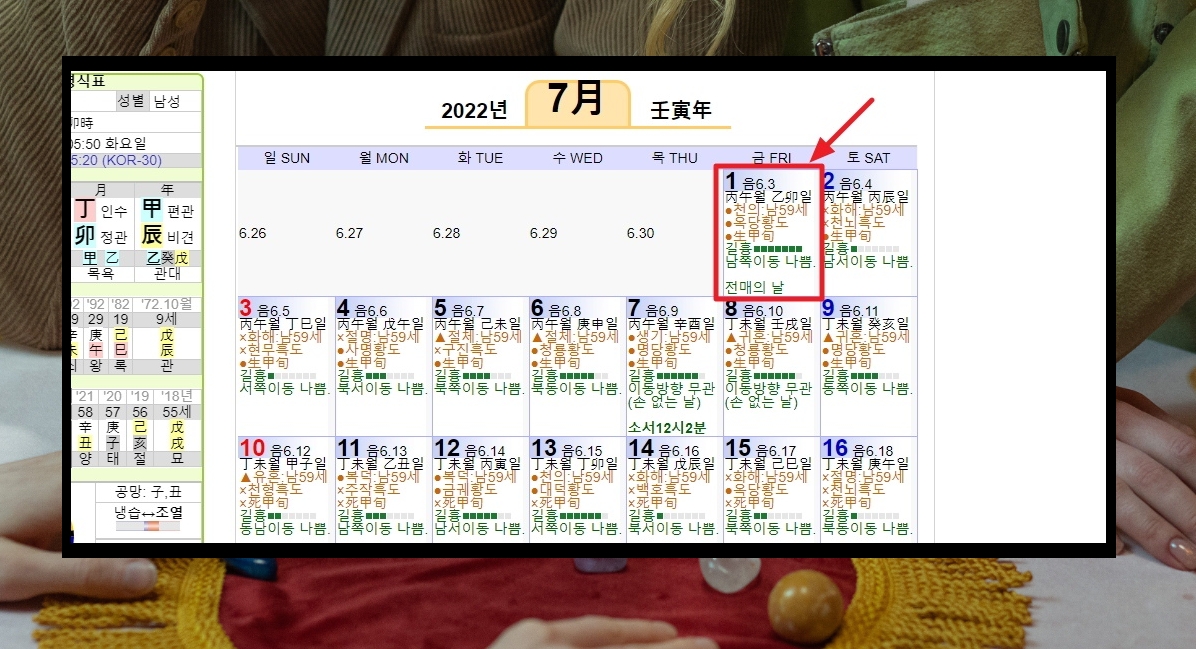 1. 다음과 같은 달력을 이용하면 데이트를 하거나 이사를 갈 때 유용합니다. 피해야 하는 방향이나 오늘 일을 진행하면 운이 좋을지 또는 나쁠지 알 수 있기 때문이죠. 만세력을 이용한 달력인데요. 상세한 해석을 보면서 함께 보기 좋은 역술 서비스입니다.