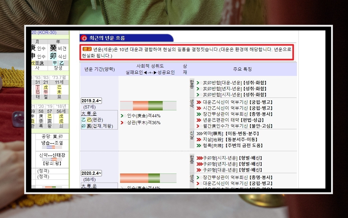 9. 대운 다음에는 년운 흐름을 살펴볼 필요가 있습니다. 대운과 결합하여 현재의 길흉을 결정 짓는 요인이기 때문입니다. 대운은 환경, 연운은 현실화를 의미한다고 보면 됩니다.