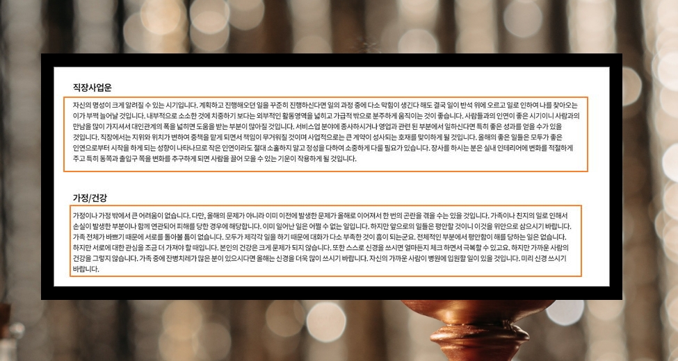 8. 사업을 하거나 직장 생활을 열심히 하고 있다면 직장사업운을 꼼꼼히 읽어보세요. 가정과 건강도 중요하니 해당 운도 꼼꼼히 보는 것을 추천해요.
