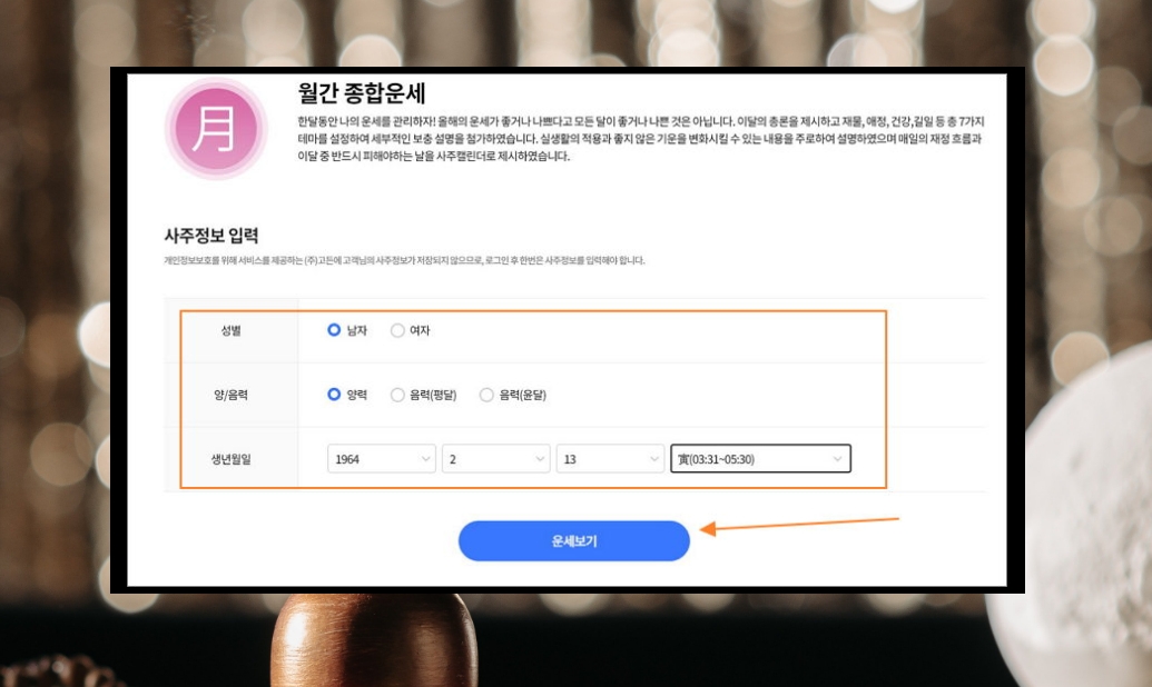 성별, 생년월일, 태어난 시각을 정확하게 입력한 후 [운세보기]를 클릭해 보세요.