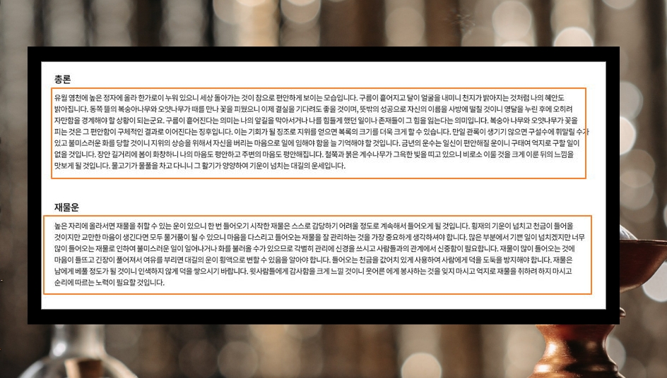 7. 이제부터 사주팔자에 대한 상세한 풀이가 나타나요. 총론의 경우 내게 들어오는 운에 대한 전체적인 평가라고 보면 돼요. 재물운의 경우에는 경제에 관련된 것이고요.