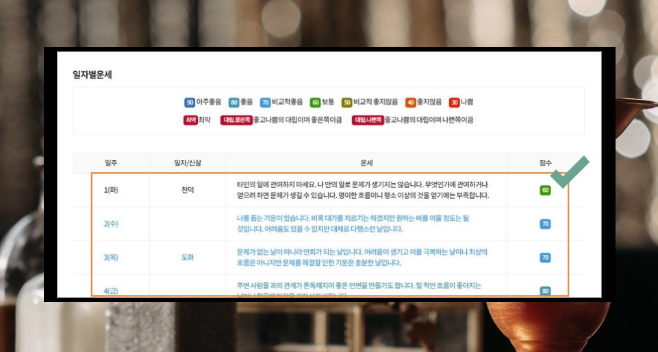 12. 일자별 운세도 확인이 가능한데요. 풀이와 함께 간단히 운의 좋고 나쁨을 파악할 수 있도록 점수도 보는 것이 가능해요.