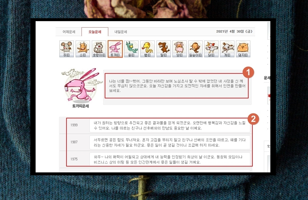 4. 가장 먼저 오늘의 운세를 보려고 합니다. 쥐, 소, 호랑이, 토끼 등 자신이 해당하는 동물을 선택해 주세요. 그럼 띠별로 어떤 운이 들어오는지와 어떻게 하면 더 좋을 질 알려줍니다. 태어난 연도에 따라서도 해석이 조금씩 달라져요.