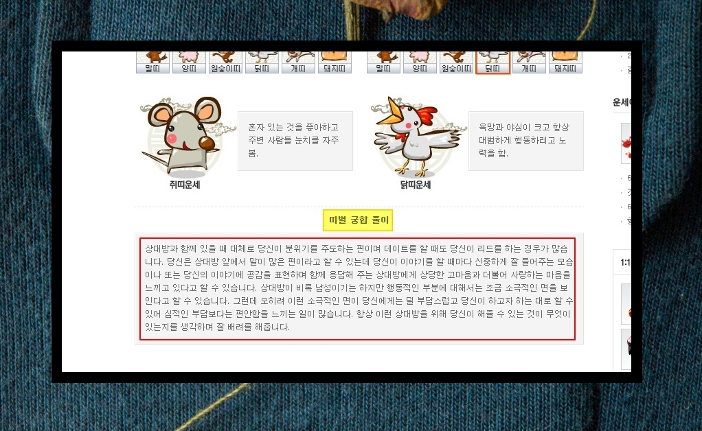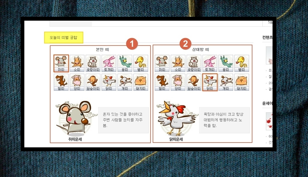 7. 사귀는 사람이 있다면 오늘의 띠별 궁합을 이용해 보세요. 본인과 상대에 대한 태어난 연도를 알고 있다면 쉽게 볼 수 있는 역술 서비스입니다. 동물 모양을 선택하면 각자 성격도 나오는데요. 나와 상대에 대해 한 번 더 알아보는 계기가 될 수 있습니다.