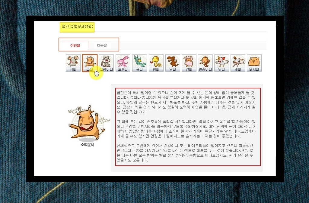 띠를 가지고 이번 달과 다음 달에 대한 나의 운세를 알아보는 것도 가능합니다. 한 달 분량이기 때문에 띠별 운세 치고는 꽤 방대한 양의 풀이를 보게 됩니다. 한 달 단위로 계획을 세울 때 참고하기 딱 좋습니다.
