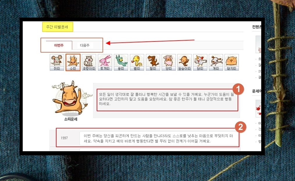 5. 주간 띠별 운세를 통해 이번 주와 다음 주에 대한 것도 알아볼 수 있습니다. 소의 경우 이번 주에 모든 일이 생각대로 잘 풀린다고 합니다. 누군가의 도움이 필요하면 도움을 요청하라고 하네요. 이렇게 나의 삶이 좀 더 나아질 수 있도록 조언을 해줍니다. 주간 띠별 운세의 경우에는 나이에 따라 한 번 더 해석 내용을 알려줍니다.