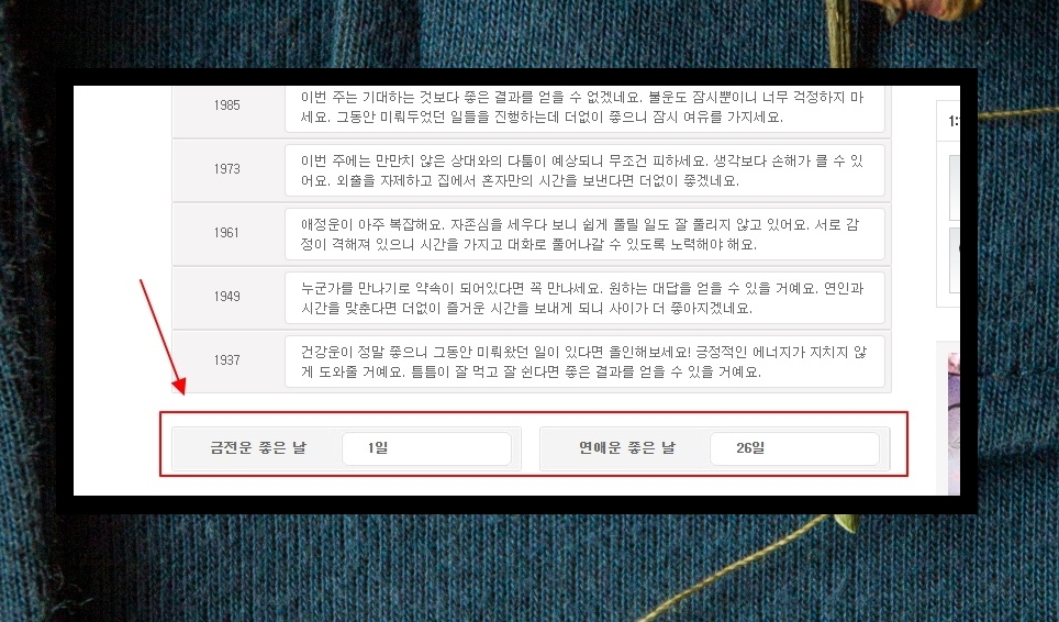 6. 또 한 가지 금전운과 연애운이 좋은 날을 알려주기도 하는데요. 투자를 할 때에는 금전운을 참고하고, 데이트나 소개팅을 할 때에는 연애운을 참고하면 되겠네요.