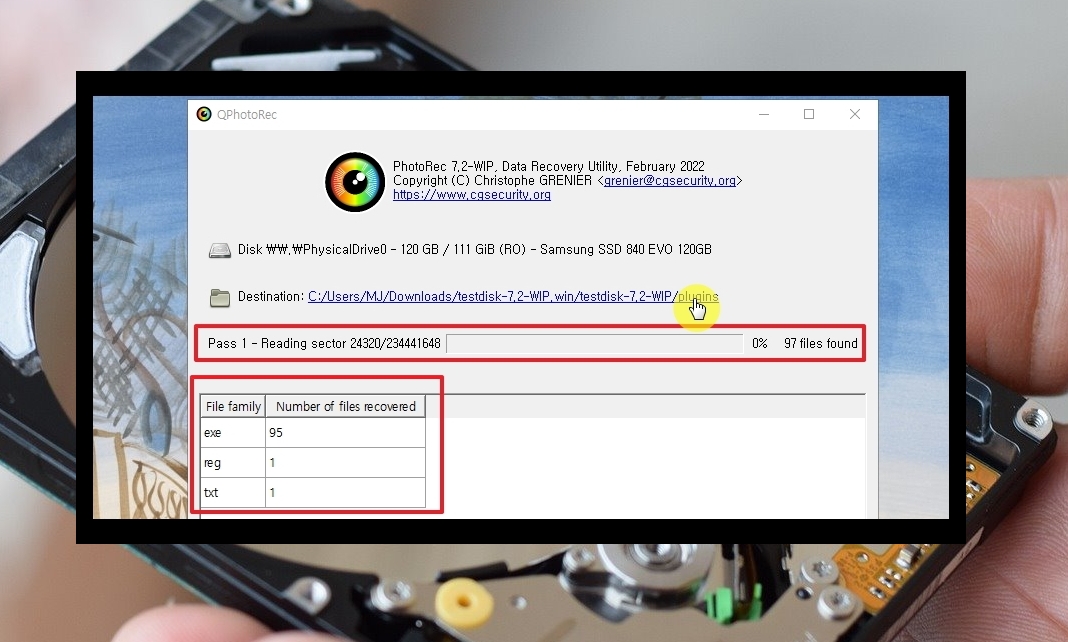 7. 0퍼센트에서 100퍼센트까지 복구가 얼마나 진행되는지 확인할 수 있습니다. 100퍼센트가 되면 "Destination" 문구 옆에 있는 파란색 폴더 주소를 클릭해 보시길 바랍니다. 그곳에서 과거 삭제된 파일을 만나볼 수 있을 겁니다.