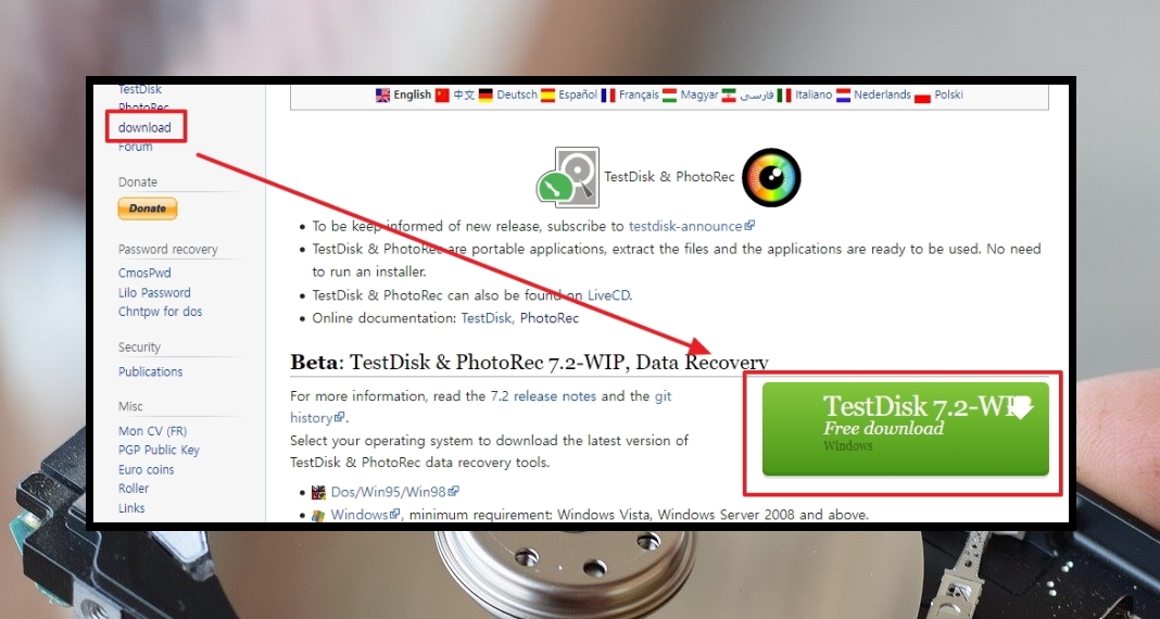 2. 사이트에 접속하면 좌측에 [download] 메뉴가 있습니다. 해당 메뉴를 클릭하면 파일 복구 프로그램인 "TestDisk"를 만나볼 수 있습니다. [TestDisk 7.2 Free download] 버튼을 클릭하면 프로그램을 다운 받을 수 있습니다.