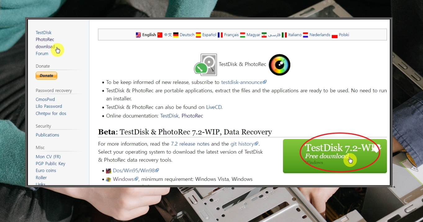 1. 일단 복구 프로그램을 다운로드 받아보도록 하겠습니다. 해외 사이트인 CGSecurity에 접속하면 됩니다. 이곳에서 프로그램을 다운 받을 수 있습니다.