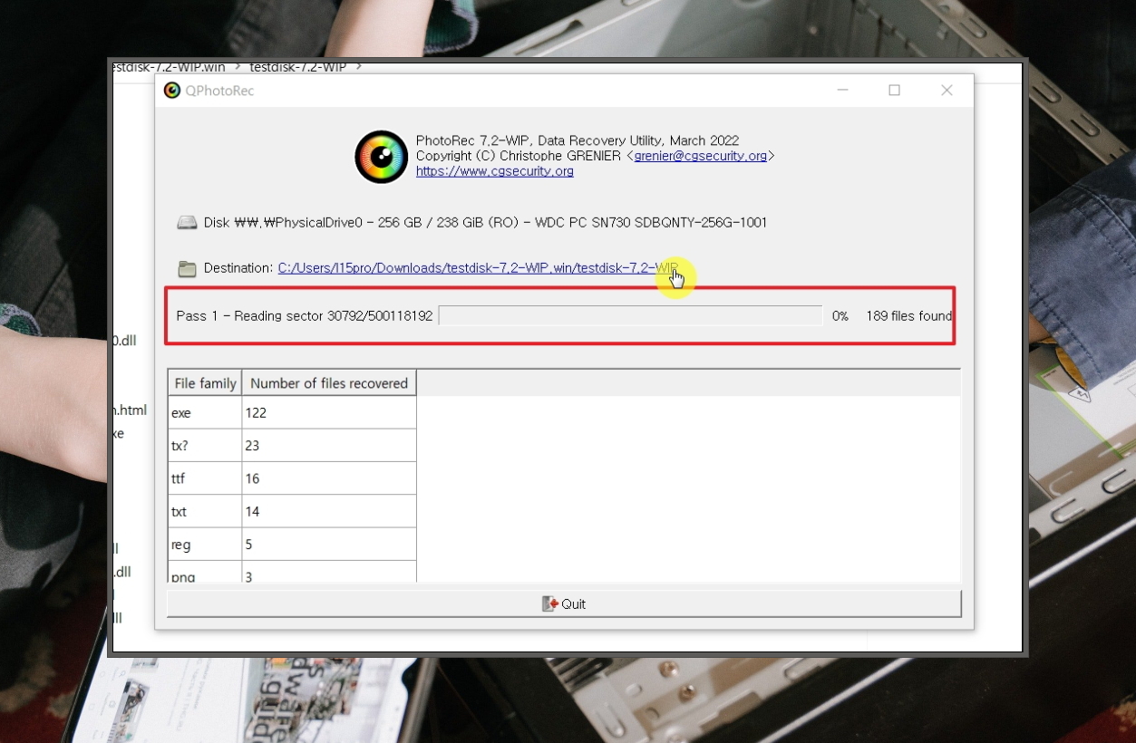 6. 진행 상황은 퍼센트로 확인이 가능합니다. 프로그램 하단에는 복구된 결과물의 갯수와 확장자를 알 수 있습니다.