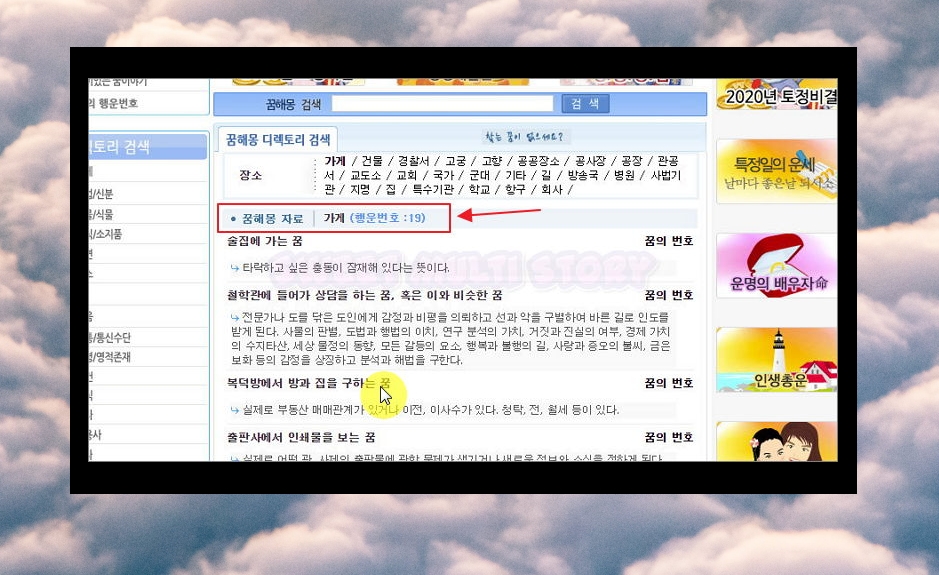 c. 이번에는 "가게"라는 키워드를 찾아보았어요. 가게에 관련된 꿈해몽 자료를 다양하게 보기 가능한데요. 여기에서 "복덕방에서 방과 집을 구하는 꿈"을 선택해보니 이사에 관련된 일이 생길 수 있다고 하네요. 그리고 가게의 경우 행운번호가 19번이에요. 로또를 구매할 때 참고하면 좋아요.
