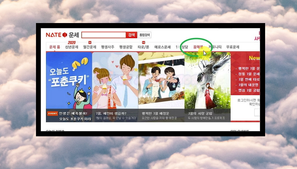 b. 네이트 사이트에 접속했어요. 여러 가지 역술 서비스가 보이는데요. 메뉴에서 [꿈해몽]을 클릭해 주세요.