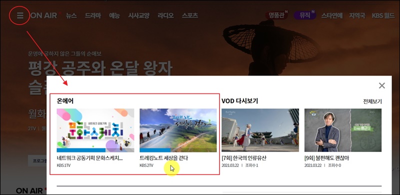 좌측 상단에 보면 메뉴 버튼이 있습니다. 해당 버튼을 클릭하면 온에어와 VOD 다시보기 서비스가 나타납니다. 현재 kbs1 tv에서는 네트워크 공동기획 문화스케치가 방영중이고, kbs2 tv 채널에서는 트레킹노트 세상을 걷다가 방영되고 있네요. 보고 싶은 프로그램을 클릭하면 바로 시청할 수 있는 페이지가 열립니다.