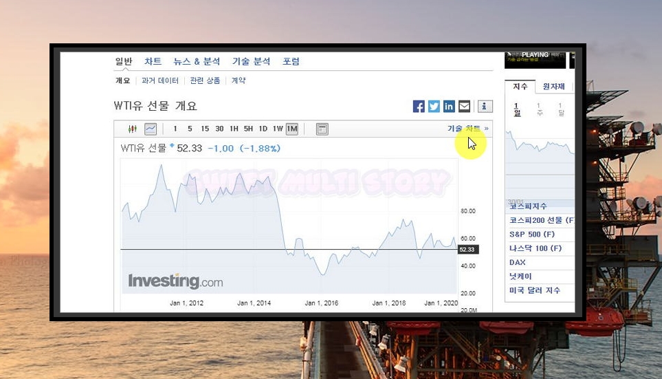 여기는 국제유가 실시간 정보를 확인하기에 좋은 곳이에요. 실시간으로 움직이는 차트도 이용할 수 있어요. 남는 컴퓨터나 모니터가 있는 경우 실시간 차트를 띄워 놓기에 딱 좋아요.