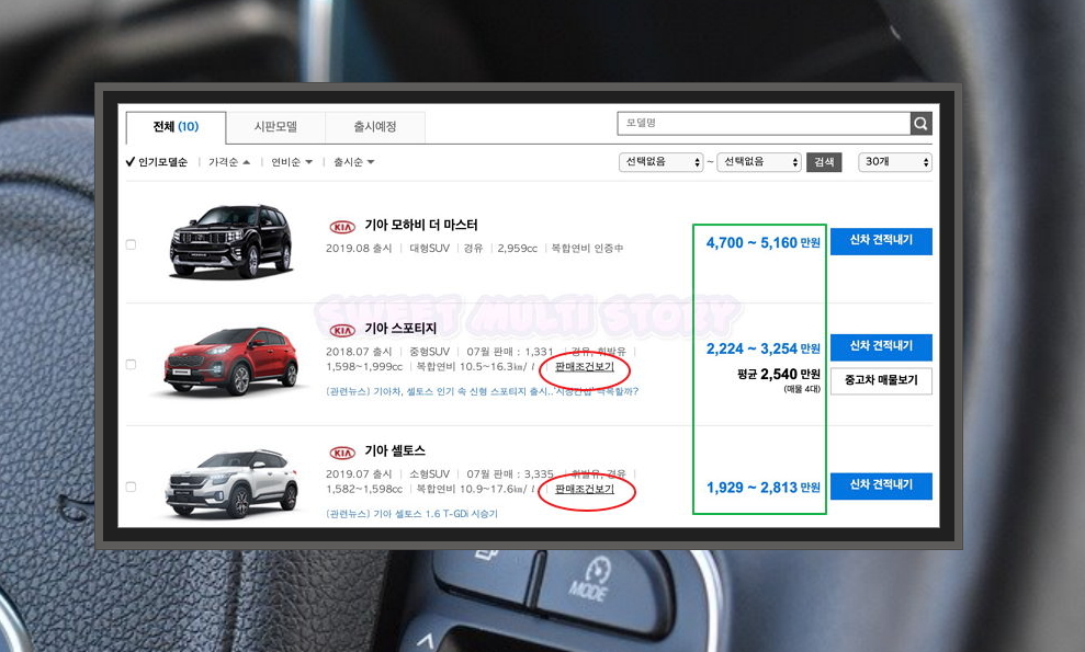 제가 지정한 조건에 따라 기아 자동차 차종별 가격표 리스트가 나타났습니다. 인기모델순으로 기아 모하비 더 마스터, 스포티지, 셀토스가 1위, 2위, 3위를 차지하고 있네요. 여기서는 3위를 차지했지만, 최근 기아 자동차의 소형SUV인 셀토스의 인기가 매우 높다고 하네요. 금액을 보아하니 차량 금액이 1,929만원과 2,813만원 사이임을 알 수 있습니다.