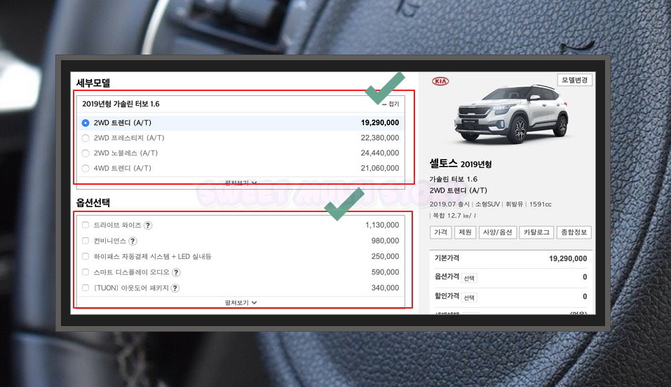 '신차 견적내기' 버튼을 누르면 원하는 조건에 따른 정확한 가격표 확인이 가능합니다. 앞서 확인한 기아 자동차 차종별 가격표를 기반으로 옵션과 세부모델을 따져 정확한 금액을 알 수 있는데요. 세부모델과 옵션을 춘차적으로 지정해 주세요.