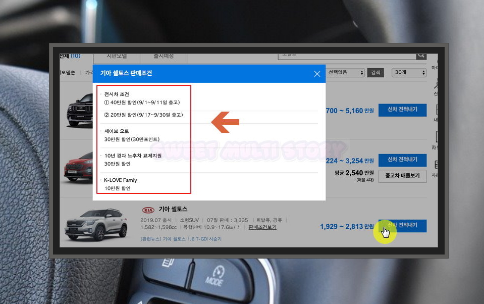셀토스의 설명을 보시면 마지막 부분에 '판매조건보기' 링크가 있습니다. 해당 링크를 클릭하면 판매조건을 알아보실 수 있어요. 전시차를 구매하는 경우 20~40만원 가량의 할인을 받을 수 있고요. 10년 경과 노후차 교체지원의 경우 30만원 할인을 받을 수 있네요.