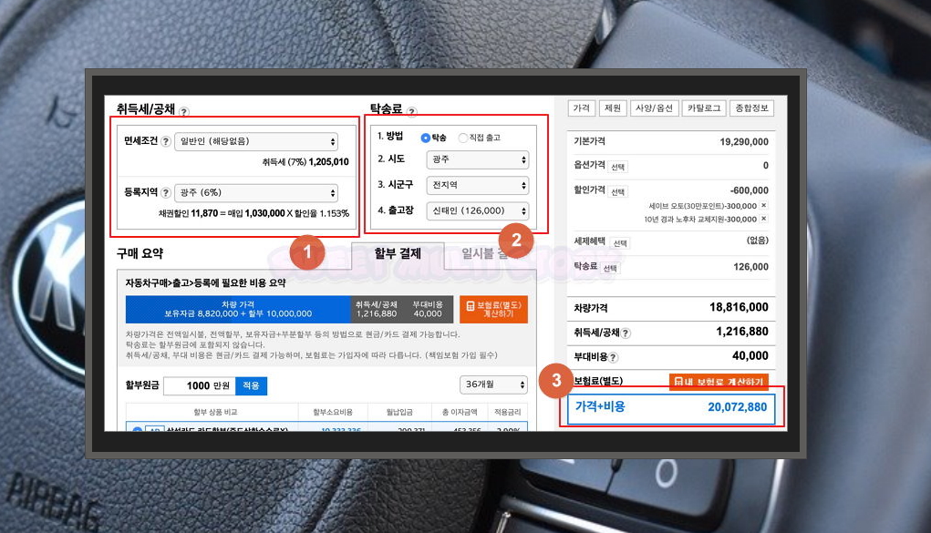 마지막으로 취득세, 공채를 계산하기 위해 명세조건과 등록지역을 지정해 주세요. 직접 자동차 공장에 가지 않는다면 탁송 서비스를 신청해야 하는데요. 출고장과 받는 곳의 위치에 따라 금액이 달라집니다. 이렇게 여러 가지 지정을 한 후 우측에 있는 가격표를 확인해 보세요. 가격표의 최하단에 최종 금액이 나타납니다.