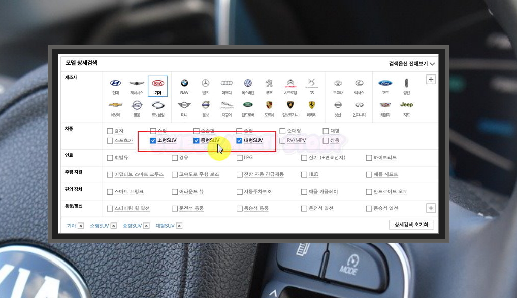 제조사, 차종별, 연료, 주행지원, 편의장치 등을 기준으로 조건 설정이 가능합니다. 기아 자동차 차종별 가격표를 알아볼 때 필히 체크해야 되는 부분인데요. 경차, 소형, 중형, 준대형, SUV 등 차종별로 선택이 가능합니다. 저는 소형SUV, 중형SUV, 대형SUV를 체크했습니다.