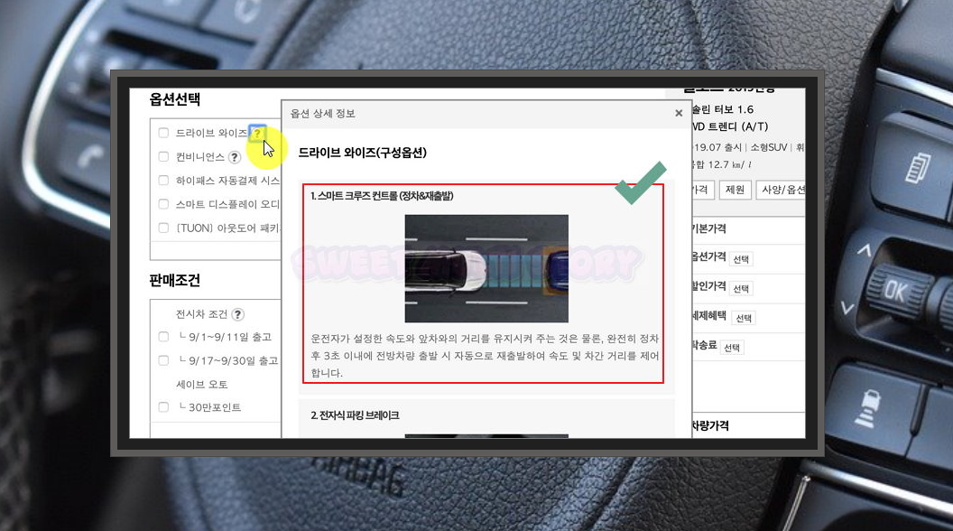 온셥을 선택할 때에는 어떤 기능을 하는지 아는 것이 중요한데요. 옵션 이름 옆에 있는 물음표를 클릭해 보세요. 그럼 옵션 상세 정보를 확인하실 수 있습니다. 드라이브 와이즈의 경우에는 제 차에도 추가한 옵션인데요. 스마트 크루즈 컨트롤, 전자식 파킹 브레이크 등 여러 옵션에 대한 내용을 조회해볼 수 있습니다.