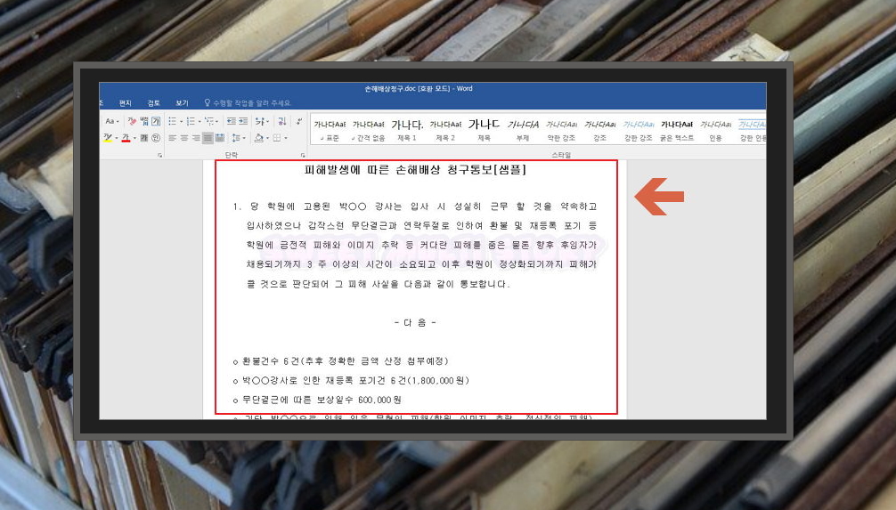 6. 무료로 다운 받아 사용할 수 있는 피해발생에 따른 손해배상 청구통보 서식을 열어 보았어요. 어떤 식으로 작성하는지 알 수 있도록 샘플 내용이 적혀 있는데요. 다운 받은 양식을 본인의 상황에 맞게 수정해서 사용하면 돼요.