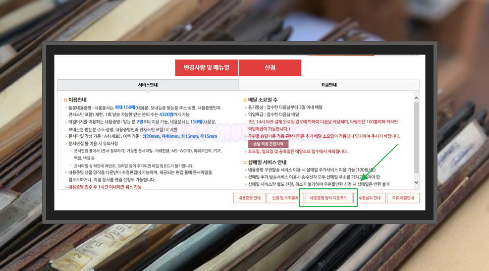 4. 신청 버튼 아래를 보면 서비스와 요금에 대한 안내를 읽어 볼 수 있는데요. 내용증명에 대한 배달 소요일 수, 샵메일 추가서비스 등이 궁금할 때 한 번 읽어보세요. 그 아래 보면 내용증명 무료서식 다운 버튼이 있어요. 클릭해 보세요.