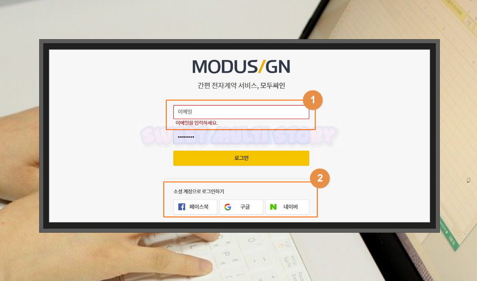 3. 회원 가입을 하셔야 모두싸인의 프로그램을 이용할 수 있어요. 이메일 주소 정도만 요구하기 때문에 부담이 없어요. 이메일 주소도 입력하기 귀찮다면 페이스북, 구글 네이버와 같은 소셜 계정으로 로그인으로 로그인을 하실 수도 있어요. 따로 계정을 만드는 절차를 진행할 필요가 없게 되죠.