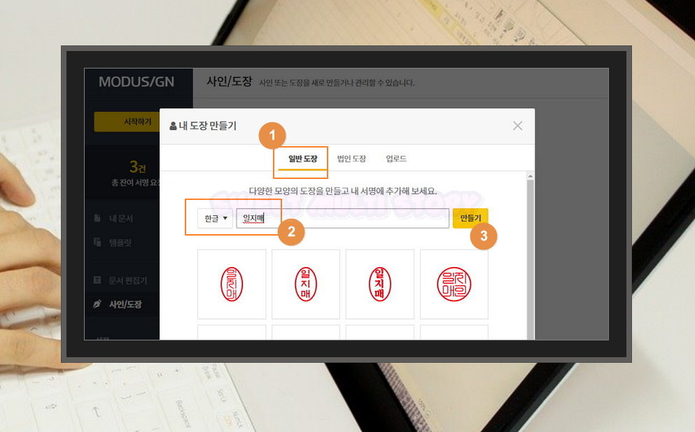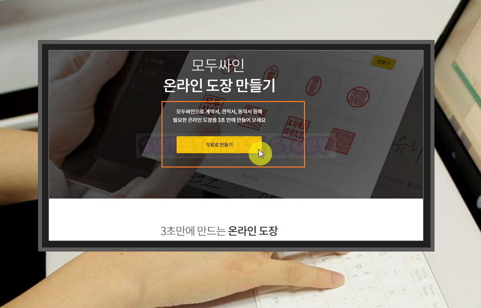 2. 모두싸인에서 말하는 바와 같이 사이트에 이용할 수 있는 프로그램을 통해 온라인 도장을 3초만에 제작이 가능해요. 견적서, 동의서, 계약서 등에 사용하기 좋죠. [무료로 만들기] 버튼을 눌러 주세요.