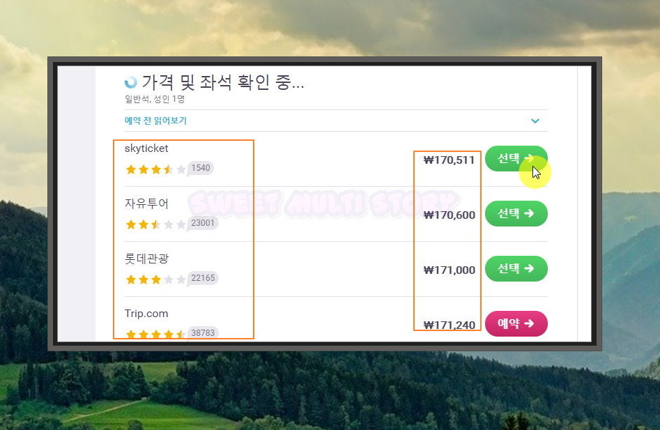 5, 이전 단계에서 항공편을 선택하셨다면 티케팅을 할 업체를 선택해야 하는데요. skyscaner에서 알려주는 별점과 가격을 참고해서 선택하시면 돼요. 자주 이용하는 업체를 따로 두고 계시지 않는다면 가장 저렴한 것이 좋아요.