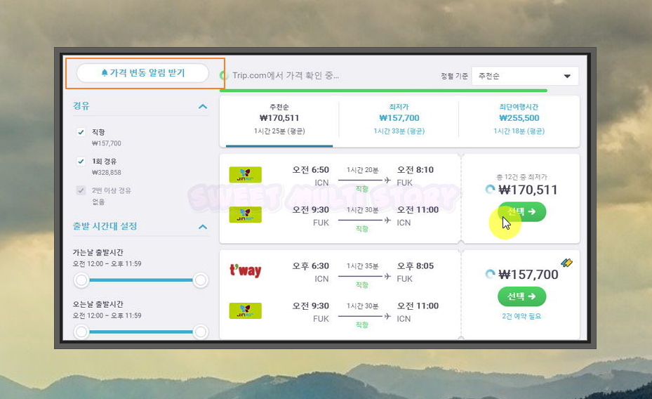 최저가 항공권을 찾았음에도 비싸다고 생각되신다면, skyscaner 사이트에서 왼쪽 상단에 있는 가격 변동 알림 받기 버튼을 눌러보세요. 더 싼 가격으로 티케팅을 할 수 있는 항공권이 생겼을 때 메일로 연락을 받을 수 있어요.