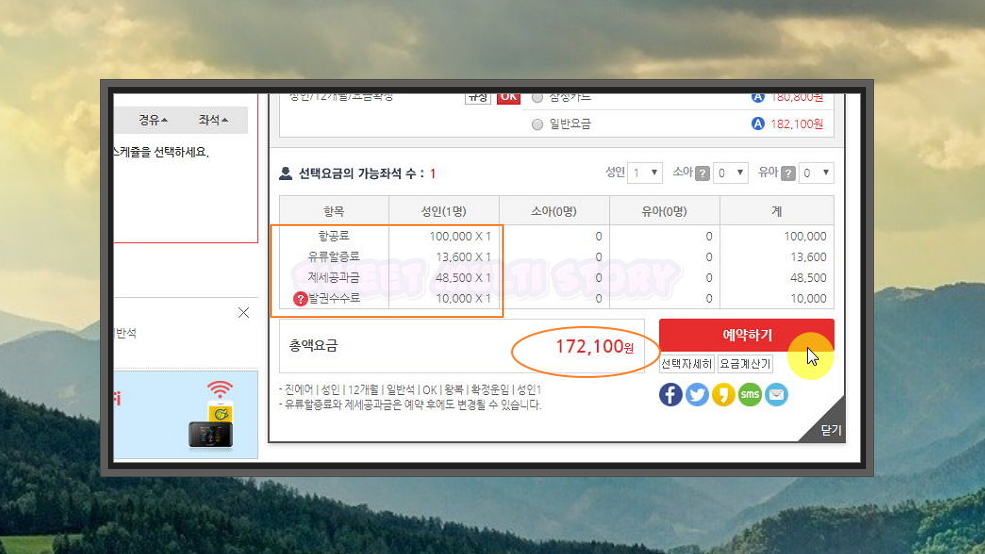 6. 업체를 선택하면 비행기표 예약을 할 수 있는 웹페이지가 열려요. skyscaner 사이트에서 본 가격, 이용하는 날짜와 시간, 유류할증료, 제세공과금 등을 꼼꼼히 확인해보세요. 다 확인하셨으면 [예약하기] 버튼을 통해 안내에 따라 예매를 진행하시면 돼요.