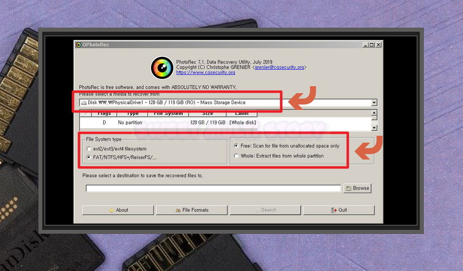 5. 복구 프로그램을 실행했어요. 가장 먼저 해야 할 것은 복구할 sd카드의 위치를 지정해주는 것이에요. 그 다음으로 할 것은 해당 카드의 File System type과 스캔을 할 영역을 지정하는 것이죠.