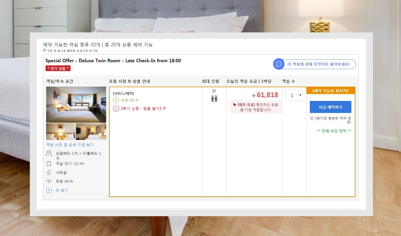 9. 그럼 "지금 예약하기" 버튼이 나타나는데요. 인기가 많은 숙소의 객실은 금방 마감이 됩니다. 마감이 되면 요금이 오르거나 예매를 할 수 없게 되는 일이 발생해요.