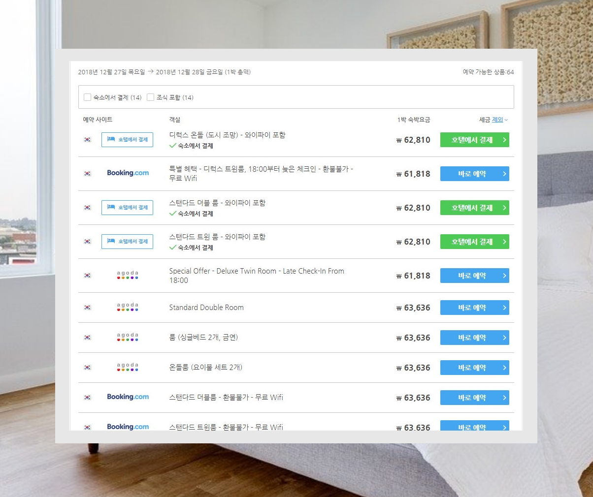 6. 해당 호텔객실에 대한 여러 가격비교사이트의 가격 정보가 나타나는데요. 이곳에서 1박 숙박요금을 기준으로 금액을 비교하면 됩니다. 객실 상태와 가격이 마음에 드는 곳이 있다면 오른쪽에 있는 버튼을 눌러 예약을 하시면 돼요.
